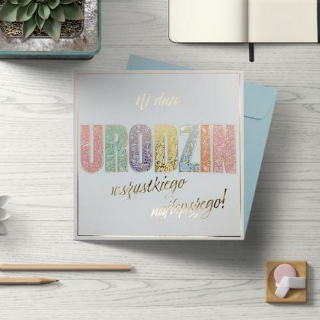 Karnet w formacie 15 x 15 cm. Wydrukowany na wysokiej jakości papierze. Karnet z tłoczonymi wzorami na całej powierzchni oraz złoceniem. W zestawie kolorowa koperta.