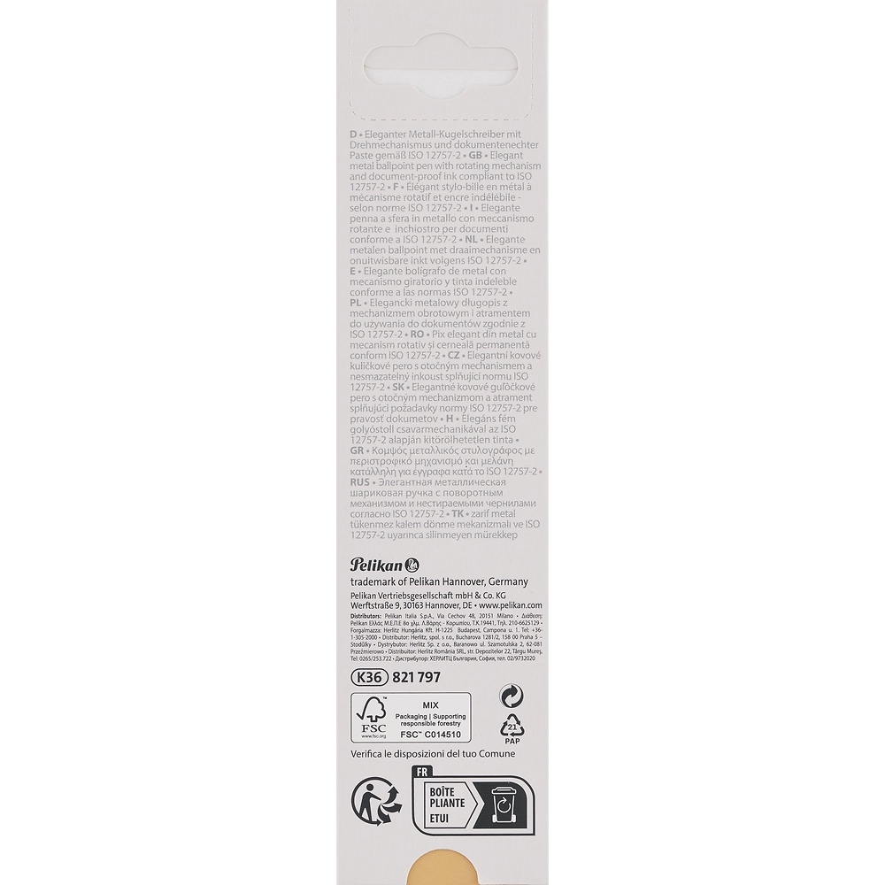 Jego perłowa, subtelna powierzchnia w połączeniu z precyzyjnie wykonanymi metalowymi elementami tworzy elegancki, a zarazem nowoczesny wygląd. Sprężynowy klips w kształcie dziobu pelikana podkreśla prestiż i nawiązuje do tradycji marki. Wygodny mechanizm obrotowy pozwala na płynne wysuwanie wkładu, a doskonałe wyważenie sprawia, że pisanie tym długopisem to czysta przyjemność. Dodatkowo, długopis nadaje się do grawerowania i nadruku, a wszystkie metalowe części są w 100% przystosowane do recyklingu, co czyni go produktem nie tylko stylowym, ale też odpowiedzialnym.