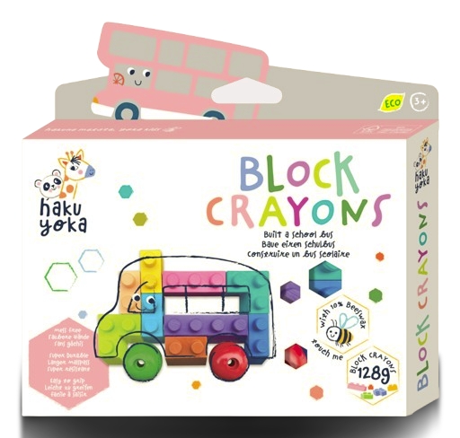 Eko kredki wykonane są z 10% wosku pszczelego, a ich opakowania wykonane są z papieru FSC.Nie pozostawiają plam.Opakowanie zawiera kredki w kształcie klocków w różnych kolorach.