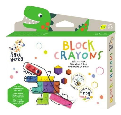 Eko kredki wykonane są z 10% wosku pszczelego, a ich opakowania wykonane są z papieru FSC.Nie pozostawiają plam.Opakowanie zawiera kredki w kształcie klocków w różnych kolorach.