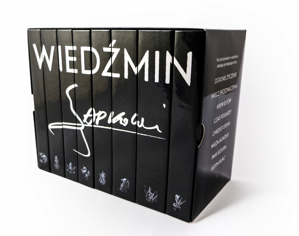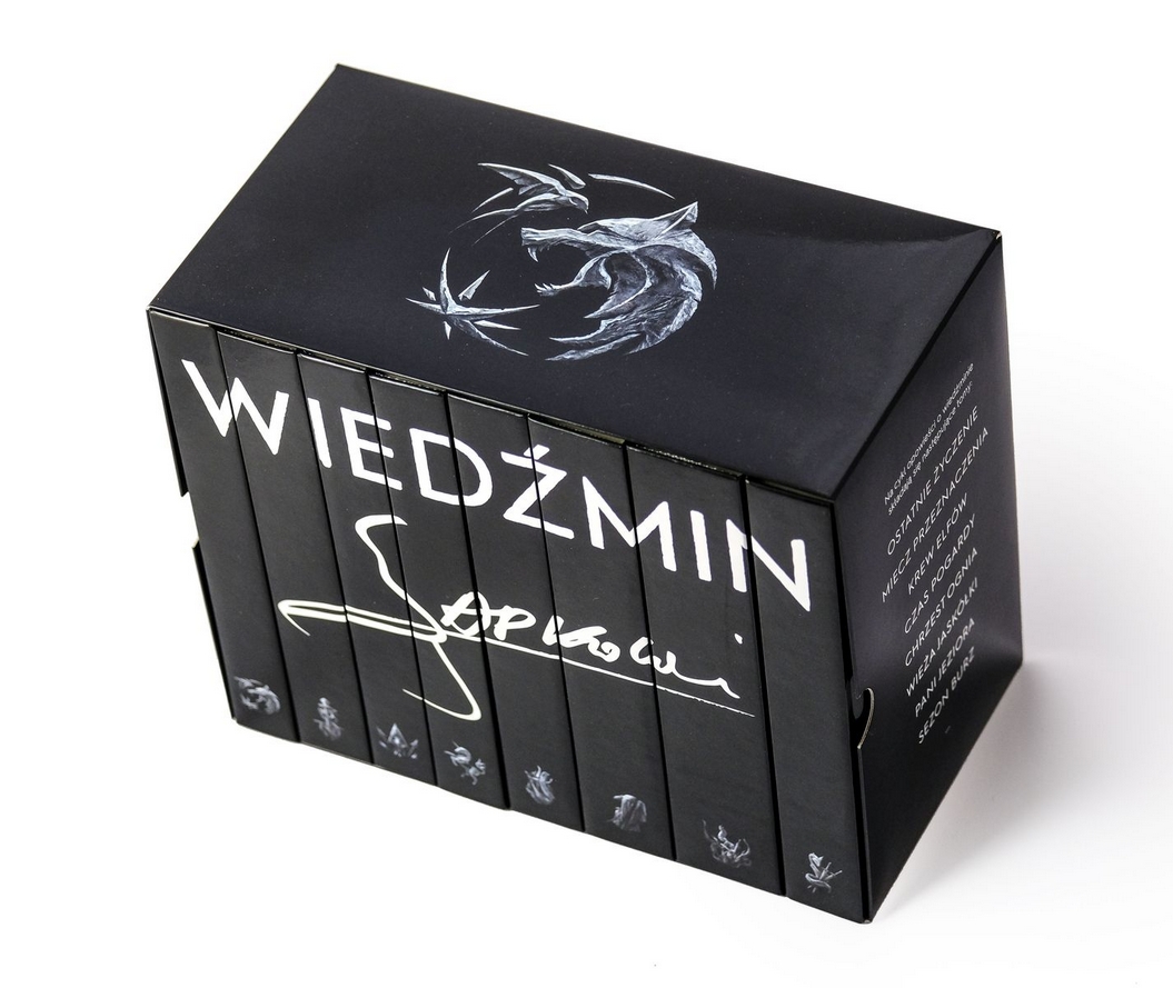 W komplecie: Wiedźmin: Ostatnie życzenie, Miecz przeznaczenia, Sezon burz, Krew elfów, Crzest ognia, Czas pogardy, Wieża Jaskółki, Pani Jeziora.