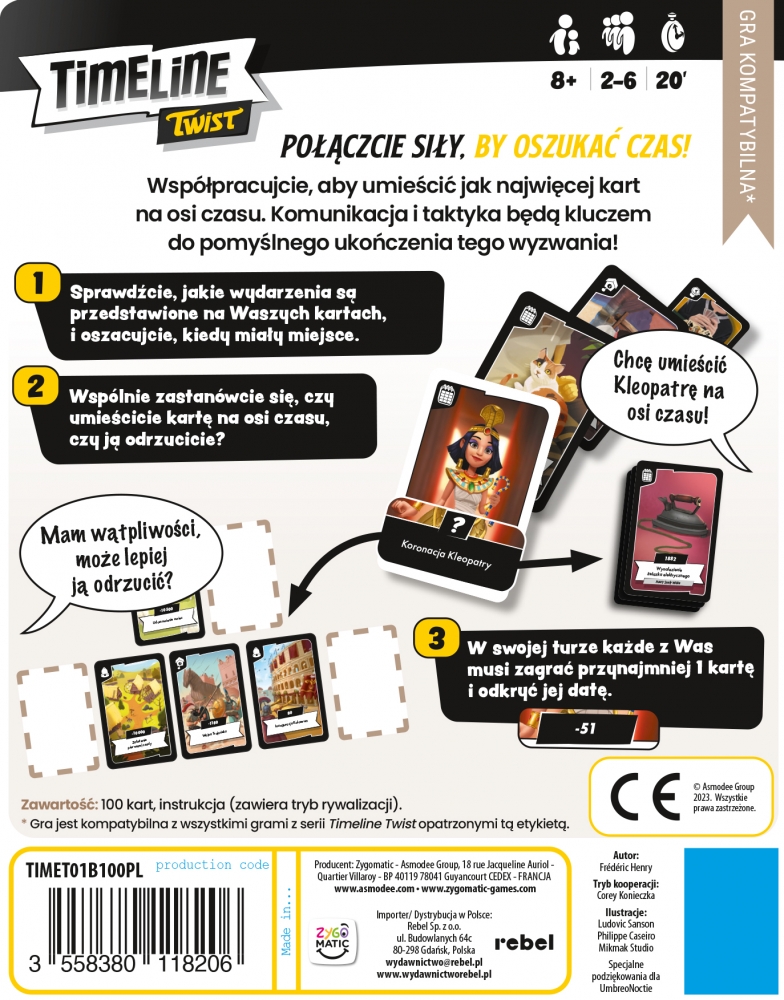 Timeline Twist to nowa edycja popularnej gry dla całej rodziny, dzięki której sprawdzicie i poszerzycie swoją wiedzę o historii! Spójrzcie, jakie wydarzenia są przedstawione na Waszych kartach i oszacujcie, kiedy miały miejsce. Zastanówcie się, czy umieścicie kartę na osi czasu, czy ją odrzucicie. Współpracujcie, by jak najwięcej kart znalazło się na właściwym miejscu. Komunikacja i taktyka będą kluczem do pomyślnego ukończenia tego wyzwania!