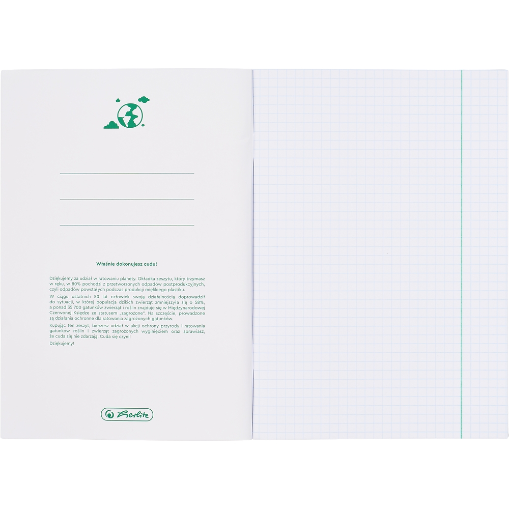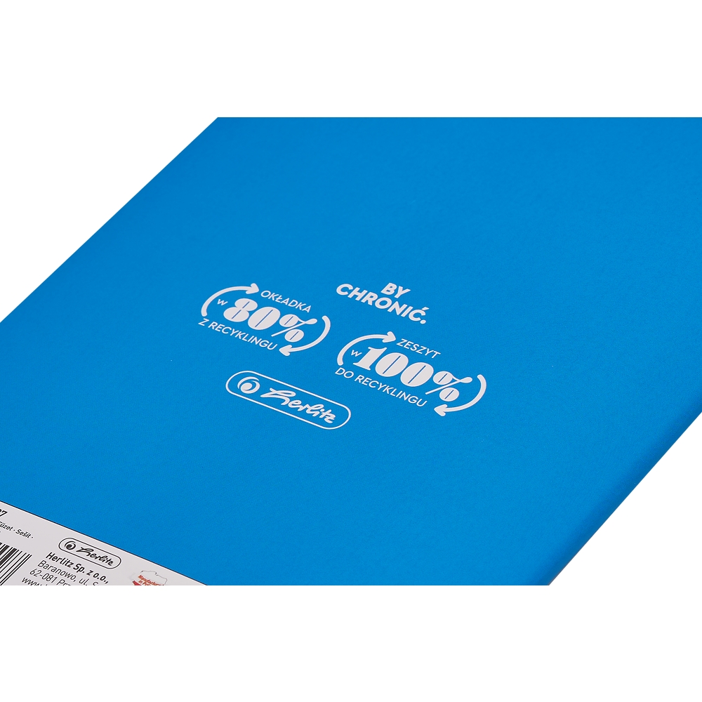 Zeszyty przedmiotowe Herlitz Eco PP to idealne rozwiązanie dla uczniów, którzy chcą łączyć funkcjonalność z dbałością o środowisko. Ich wyjątkowa konstrukcja opiera się na dwuwarstwowej okładce – zewnętrznej, wykonanej z mlecznego polipropylenu, oraz wewnętrznej, z zadrukowaną grafiką przedmiotową. Co ważne, aż 30% materiału pochodzi z przetworzonych odpadów pokonsumenckich, takich jak sieci rybackie, liny i włókna morskie wyłowione z oceanów. Okładka jest wodoodporna i trwała, dzięki czemu nie wymaga dodatkowych osłon – skutecznie chroni zawartość zeszytu nawet przy intensywnym użytkowaniu. Niebieska liniatura z zielonym marginesem doskonale wpisuje się w ekologiczny styl kolekcji, a na stronie tytułowej znajduje się adresówka do podpisania, natomiast wewnątrz – ściągi z wybranego przedmiotu.