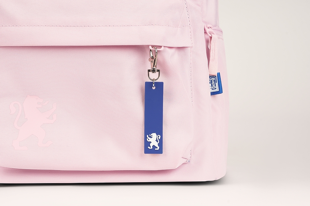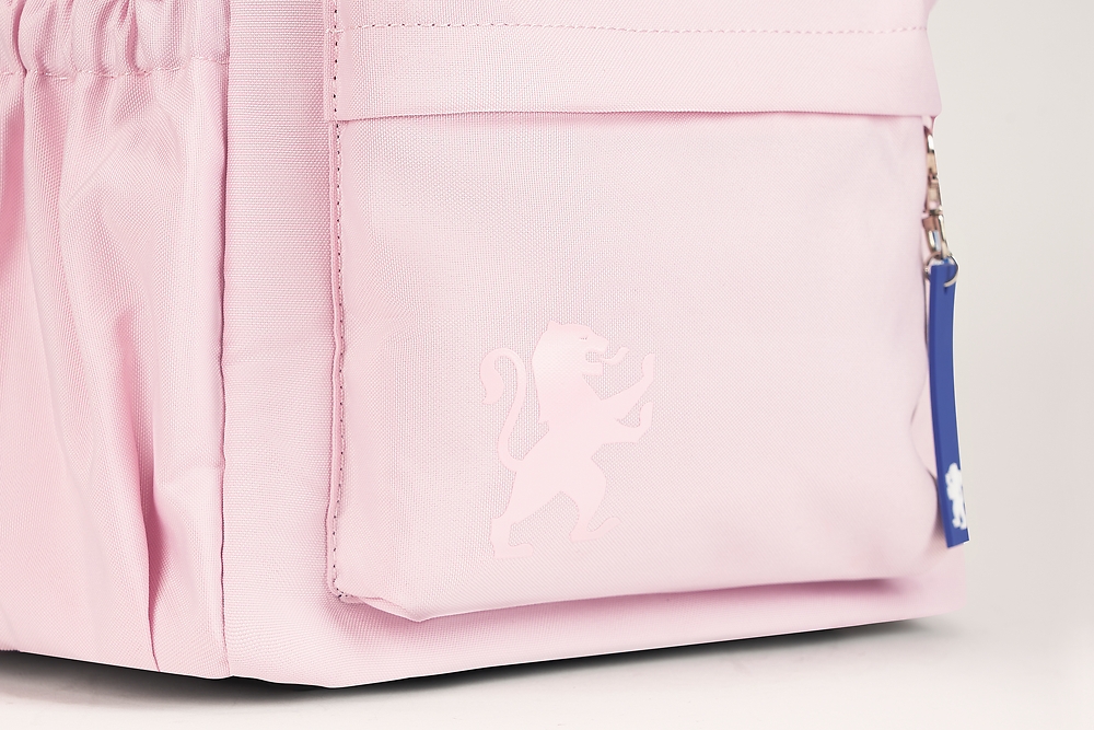 - Jednolity pastelowo-różowy kolor i niebieska podszewka z wytłoczonymi lwami