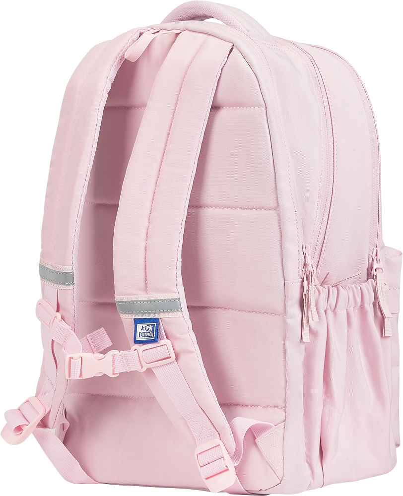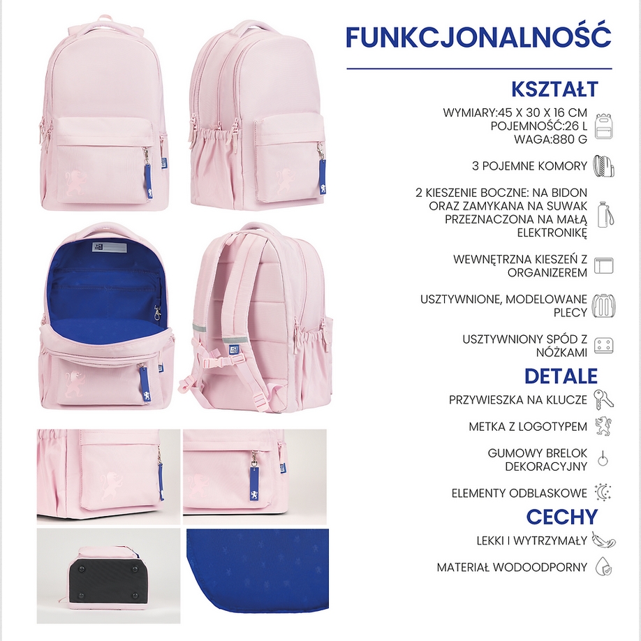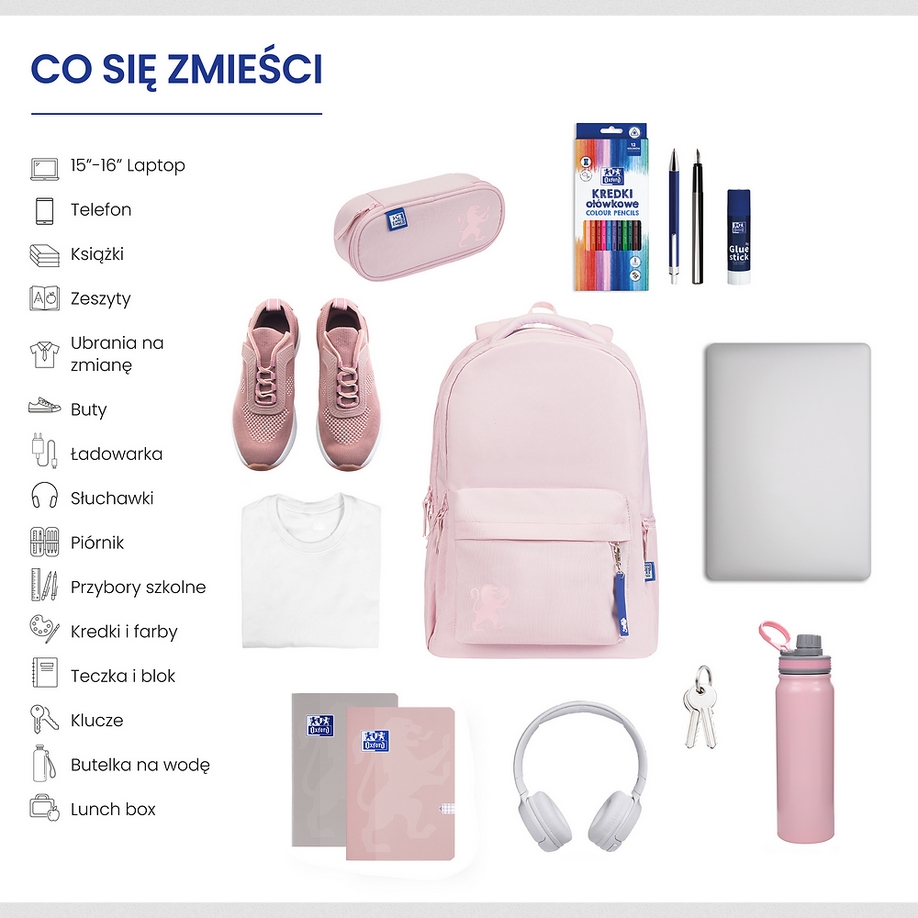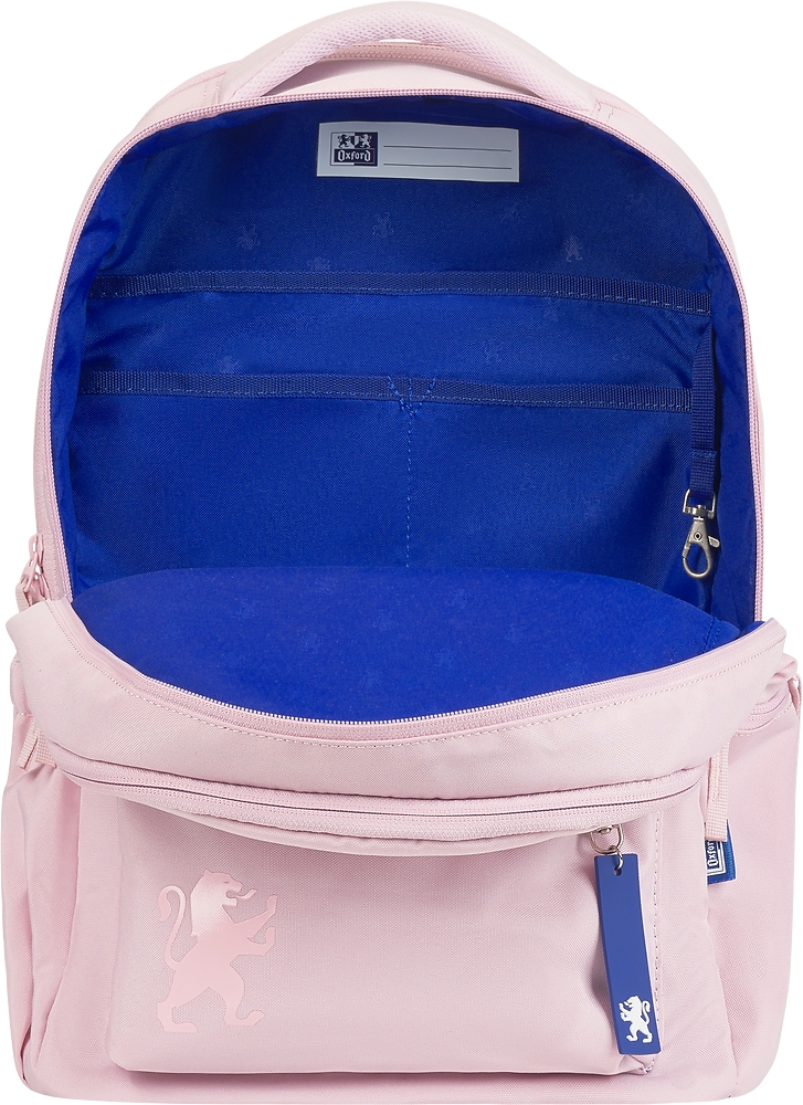 Funkcjonalny plecak Oxford School w jednolitym kolorze dla uczniów klas 4 – 8, szkoły średniej lub na trening sportowy. Posiada aż 3 komory pełniące różne funkcje. Pierwsza od strony pleców, to wyściełana komora z kieszenią na laptopa/notebooka do 16". Pomieści również wszelkiego rodzaju teczki, zeszyty czy bloki w formacie A4. W drugiej środkowej znalazły się 3 dodatkowe kieszenie wewnętrzne i przywieszka na klucze. W trzeciej, ostatniej komorze dodany został podręczny organizer zamykany na suwak. Całe wnętrze plecaka wyściełane jest podszewką w niebieskim kolorze, który reprezentuje markę Oxford wraz z nadrukiem lwa powtarzającym się regularnie na całej powierzchni podszewki. Z przodu plecaka znajduje się zewnętrzna kieszeń zamykana na suwak wraz z silikonowym breloczkiem z logo Oxford. Po obu stronach plecaka znajdują się kieszenie zewnętrzne. Jedna otwarta na bidon, druga zamykana na suwak przeznaczona na dokumenty lub telefon.
