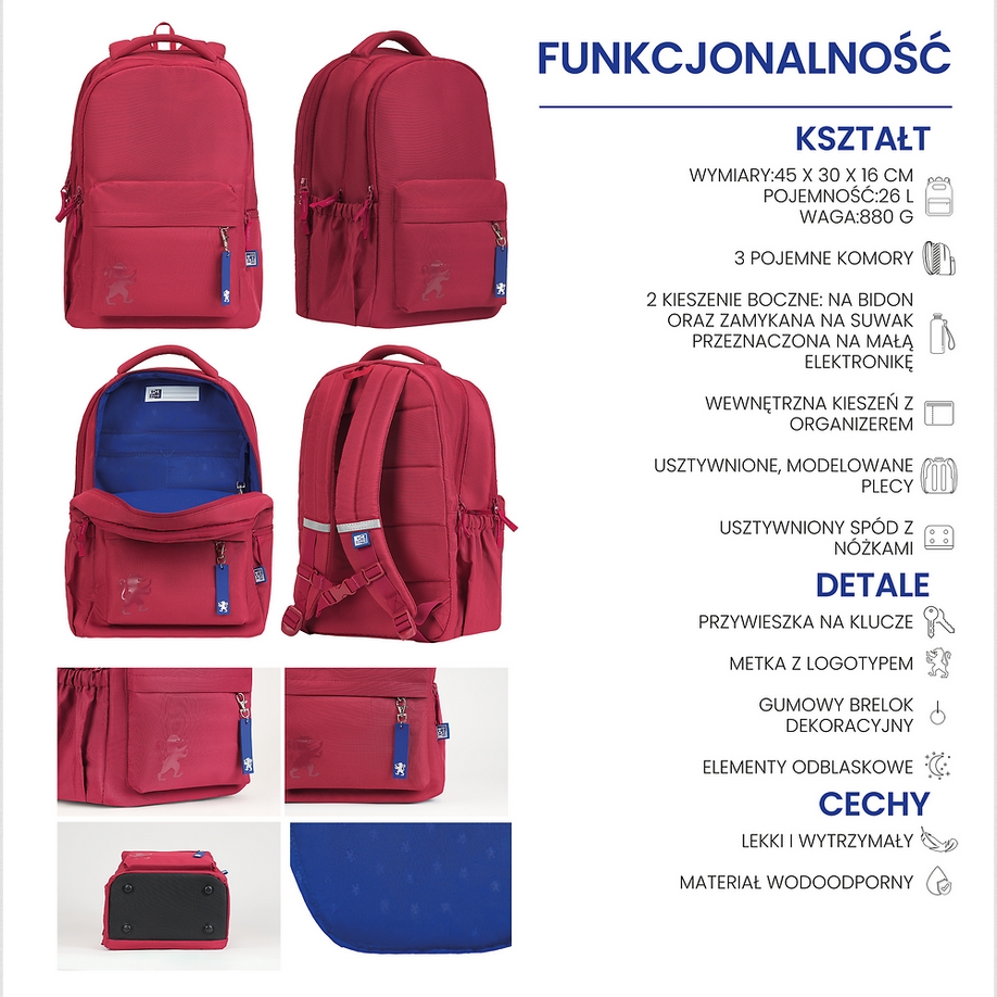 - 3 pojemne komory pozwolą spakować niezbędne szkolny przybory