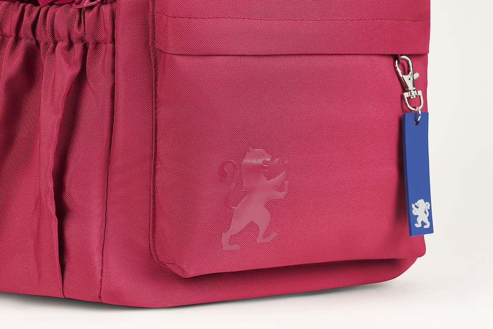 - Jednolity żurawinowy kolor i niebieska podszewka z wytłoczonymi lwami