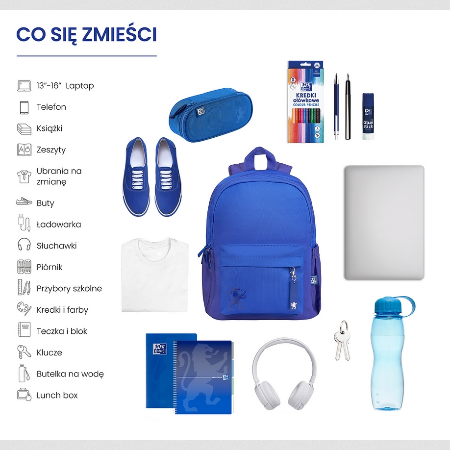 Funkcjonalny plecak Gradient w przechodzącym kolorze dla uczniów klas 4 – 8, szkoły średniej lub na trening sportowy. Posiada 2 komory pełniące różne funkcje. W pierwszej od strony pleców, znalazły się 3 dodatkowe kieszenie wewnętrzne i przywieszka na klucze. W drugiej komorze dodany został podręczny organizer zamykany na suwak. Całe wnętrze plecaka wyściełane jest podszewką w niebieskim kolorze, który reprezentuje markę Oxford wraz z nadrukiem lwa powtarzającym się regularnie na całej powierzchni podszewki. Z przodu plecaka znajduje się zewnętrzna kieszeń zamykana na suwak wraz z silikonowym breloczkiem z logo Oxford. Po obu stronach plecaka znajdują się otwarte kieszenie na bidon lub inne drobiazgi. Plecy w modelu Gradient są lekko usztywniane i posiadają modelowane przeszycia, całości dopełniają miękkie, profilowane szelki pokryte siatką mesh, aby zapewnić dobrą stabilizację dla ramion, a ich regulacja za pomocą taśm, zwiększa komfort codziennego użytkowania. Szeroka taśma-uchwyt pozwoli powiesić plecak w dowolnym miejscu.
