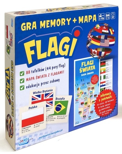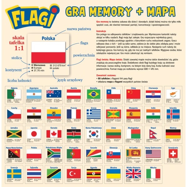 Flagi świata. Mapa świata. Dzięki zawartej mapie można także dowiedzieć się, gdzie znajdują się poszczególne kraje. Dodatkowo obok flagi każdego kraju są skrótowe informacje: nazwa stolicy, kontynent, na którym leży dany kraj, liczba ludności oraz powierzchnia. Format mapy po rozłożeniu wynosi 680 x 476 mm.