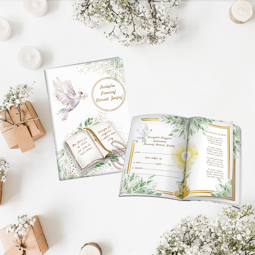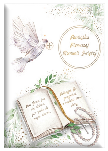 Książeczka A5 Pamiątka Komunijna MODLITEWNIK wydrukowana na wysokiej jakości papierze formatu A5. Okładka książeczki z papieru perforowanego i uszlachetniana jest złotem. Książeczka 12 stronicowa z tekstem i grafiką. Książeczka z kopertą na pieniądze