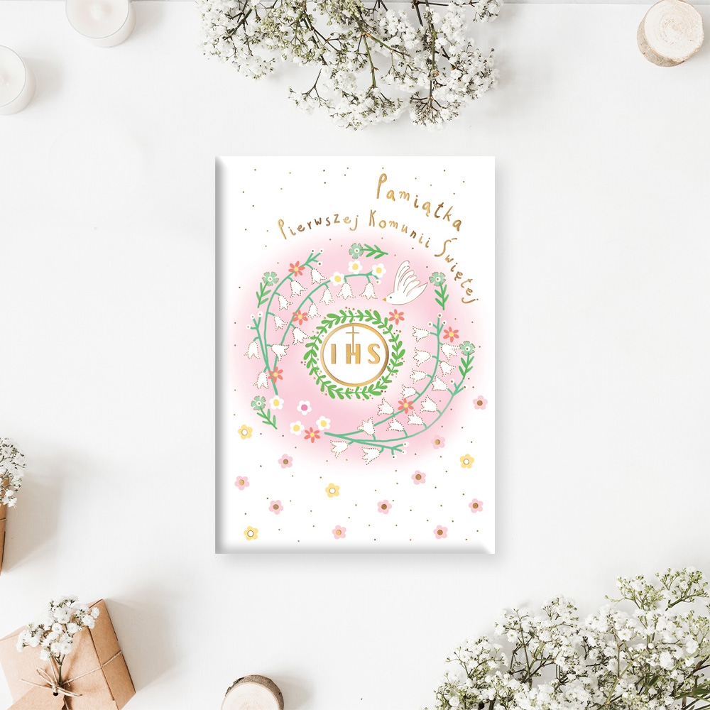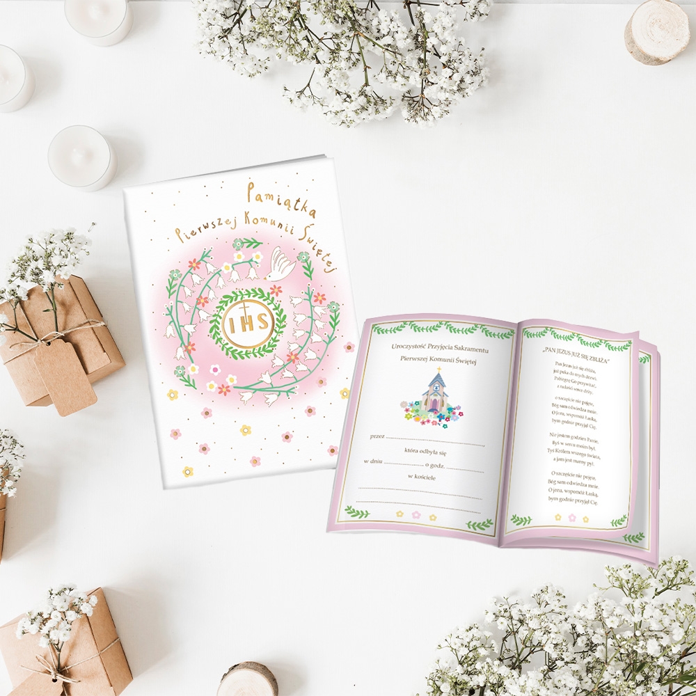 Książeczka A5 Pamiątka Komunijna. Gołąb różowy