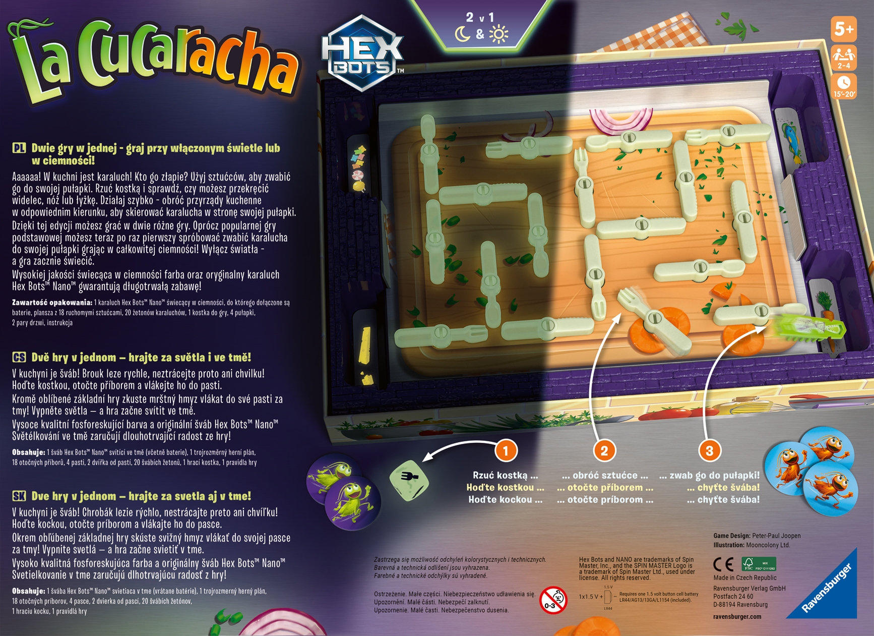 La Cucaracha to szybka i zabawna gra w pościg z oryginalnym robalem HEXBUG® nano™ świecącym w ciemności. Oryginalna edycja zdobyła już kilka nagród, w tym niemiecką nagrodę German Games Award dla najlepszej gry dla dzieci 2013 roku.