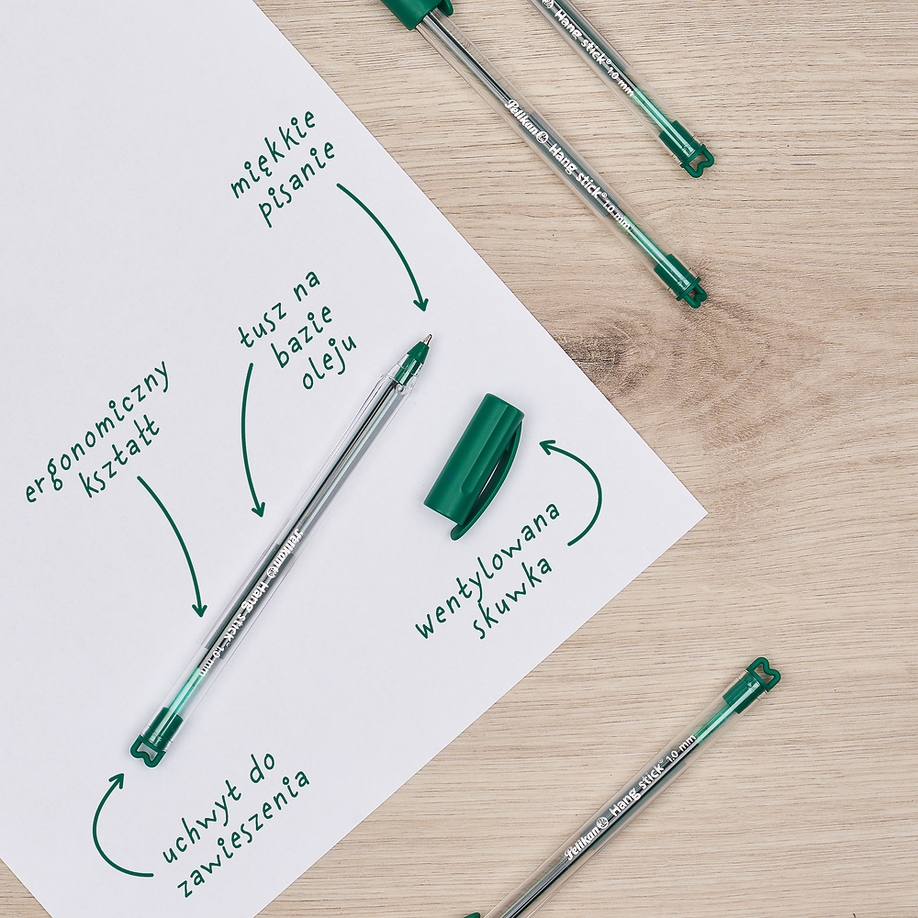 Długopis Pelikan Hang Stick to praktyczne i niezawodne narzędzie do codziennego pisania, które łączy wygodę użytkowania z funkcjonalnymi detalami. Dzięki ergonomicznemu kształtowi o przekroju zbliżonym do trójkąta, idealnie dopasowuje się do dłoni, zapewniając komfort nawet podczas długiego pisania. Tusz na bazie oleju gwarantuje miękki i płynny ruch po papierze. Co go wyróżnia? Specjalny uchwyt na końcówce, który umożliwia zawieszenie długopisu lub przymocowanie go do wybranego przedmiotu – idealne rozwiązanie dla miejsc, gdzie pisak powinien być zawsze na swoim miejscu. Wentylowana skuwka zwiększa bezpieczeństwo, a jednorazowa konstrukcja sprawia, że jest gotowy do użycia i nie wymaga wymiany wkładów.