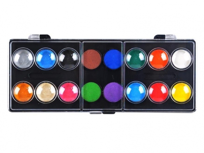 Zestaw farb wodoodpornych, 11 klasycznych i 5 metalizowanych kolorów, wielkość krążka 23 mm. Odpowiednie do malowania po papierze lub kartonie. Doskonała zabawa dla dzieci, pomaga rozwijać mała motorykę oraz wyobraźnię. - odpowiednie do użytku w szkole i w celach hobbystycznych - świetne krycie i jakość - rozcieralne wodą - mieszając można uzyskać różne odcienie kolorów, od gęstych nieprzezroczystych po transparentne - średnica farby wynosi 23 mm - nie zawiera substancji toksycznych OPAKOWANIE ZAWIERA: - 11 szt. farb w klasycznych kolorach - 5 szt. farb w kolorach metalizowanych OSTRZEŻENIE: Nieodpowiednie dla dzieci do 3 lat. Niebezpieczeństwo połknięcia małych części. EN71-1,2,3,9 Cena za 1 szt. Ostrzeżenie: Ryzyko zadławienia. Małe części. Produkt spełnia certyfikację CE Produkt jest przeznaczony dla dzieci od 3 lat Wymiar: 85mm x 215mm x 10mm (szer. x wys. x gł.)