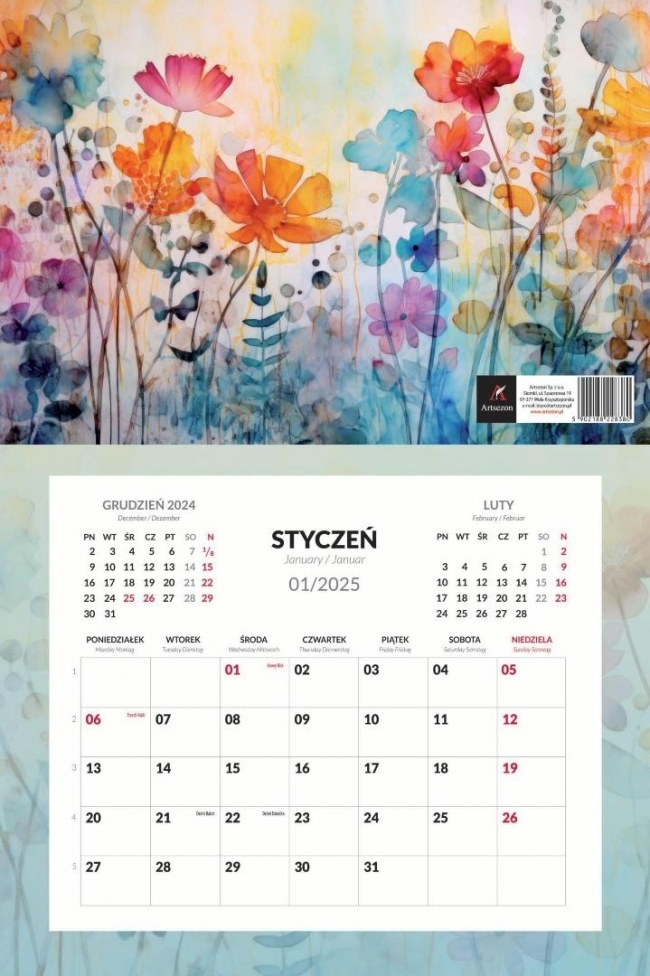 dostępny w 4 wzorach, kalendarium miesięczne + miniatury 2 miesięcy, płaska główka, rozmiar 45x30cm, eurodziurka do zawieszenia