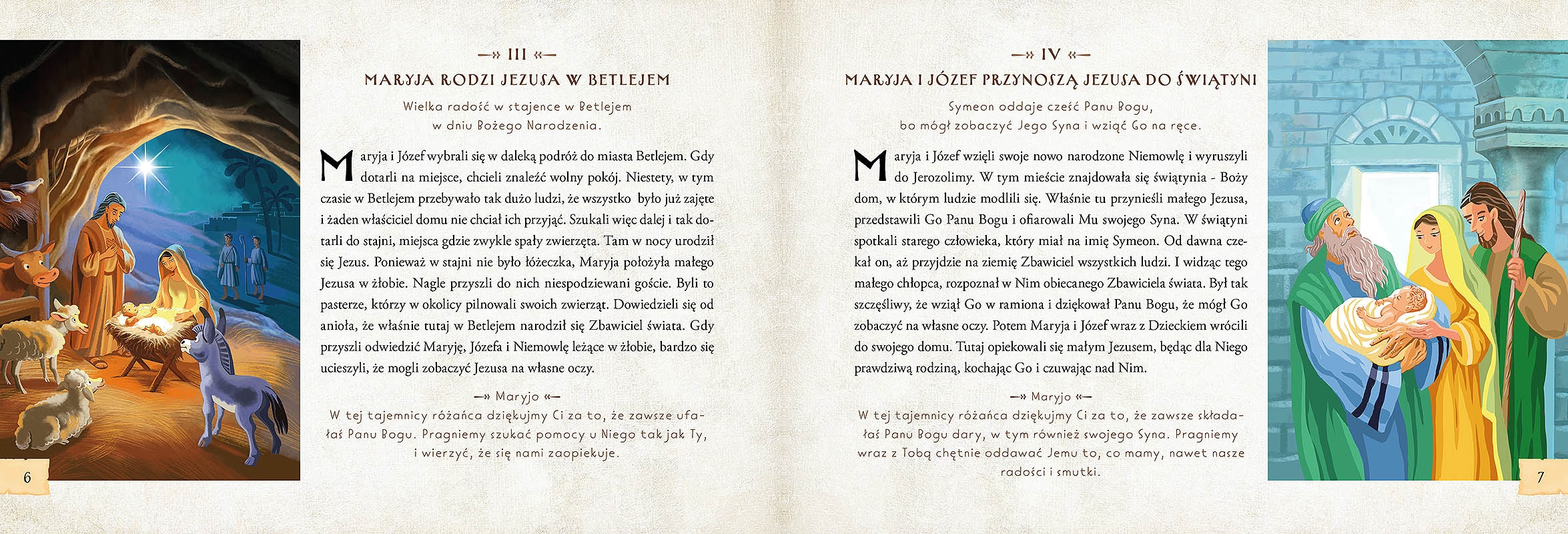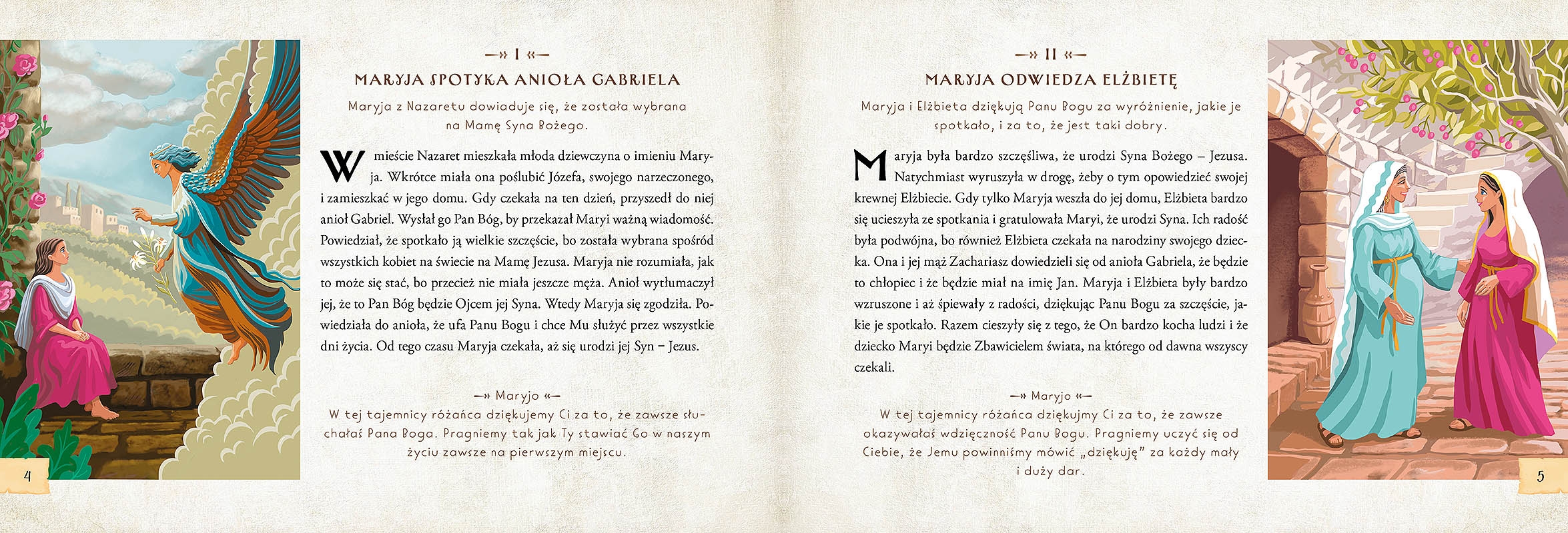 Napisana przez znanego autora książek religijnych dla dzieci, będzie niezastąpioną pomocą dla księży i katechetów, a także wspaniałą propozycją dla wszystkich pragnących modlić się samodzielnie lub z bliskimi. Przedstawia ona poszczególne tajemnice różańca, odnosząc je do najważniejszych wydarzeń z życia Jezusa i Maryi, lecz wyjątkowe jest w niej zaproponowane przez autora umocowanie wszystkich rozważań w tekstach Pisma Świętego. W tym celu – opierając się na Tradycji Kościoła katolickiego – wykorzystał on teksty biblijne z Nowego, a także ze Starego Testamentu, które liturgia odnosi do Najświętszej Maryi Panny.