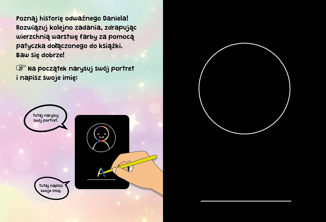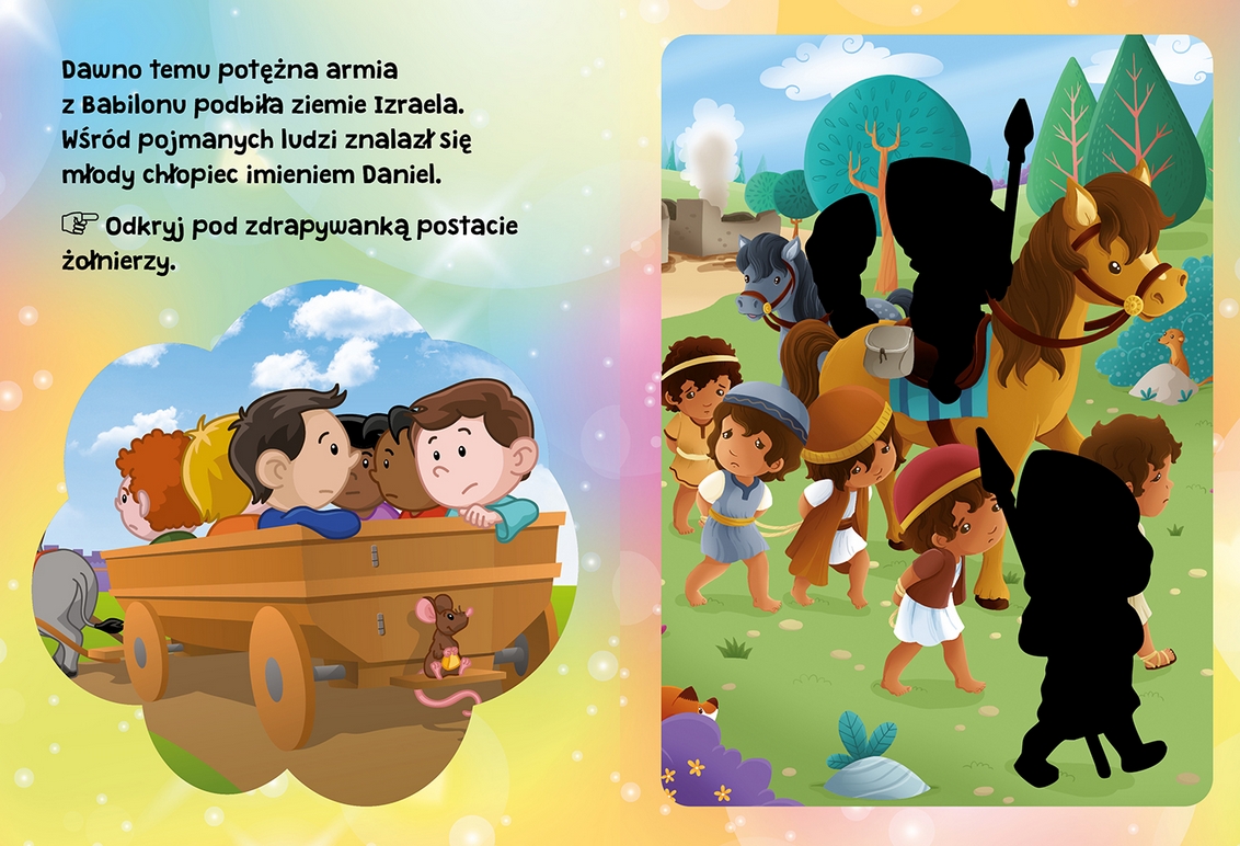 Poznaj historię odważnego Daniela, który dzięki modlitwie, odwadze i Bożej opiece uniknął śmierci w jaskini pełnej lwów! Rozwiązuj kolejno zadania, zdrapując wierzchnią warstwę farby za pomocą patyczka dołączonego do książki. Baw się dobrze!Kraj produkcji: PL