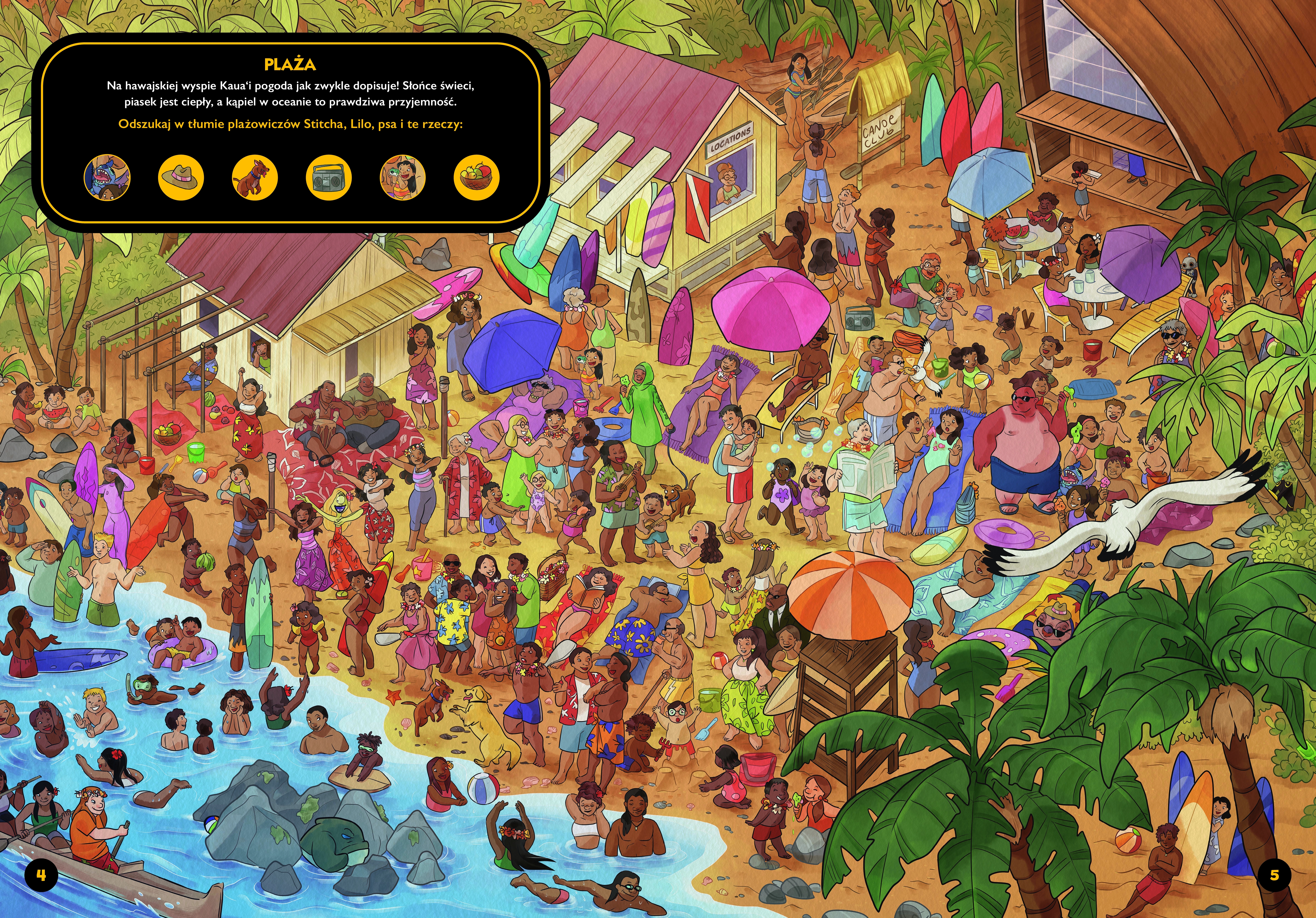 Szukaj ulubionych bohaterów z filmu i różnych przedmiotów ukrytych na kolorowych, pełnych szczegółów ilustracjach. Wśród poszukiwanych są: Stitch, Lilo, Nani, Jumba i wielu, wielu innych…