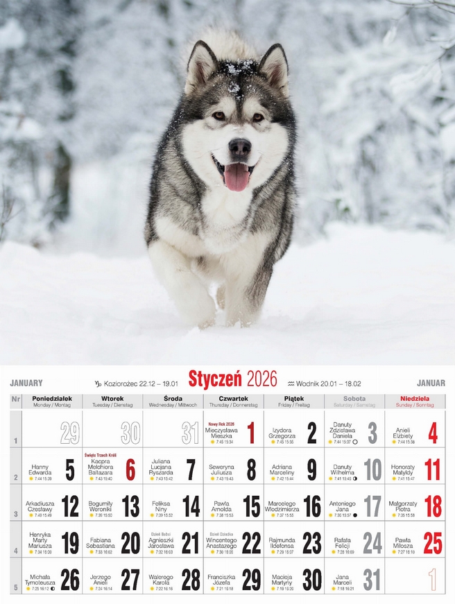 - Wygodny, niewielki kalendarz ścienny, drukowany na papierze kredowym w oprawie spiralnej.