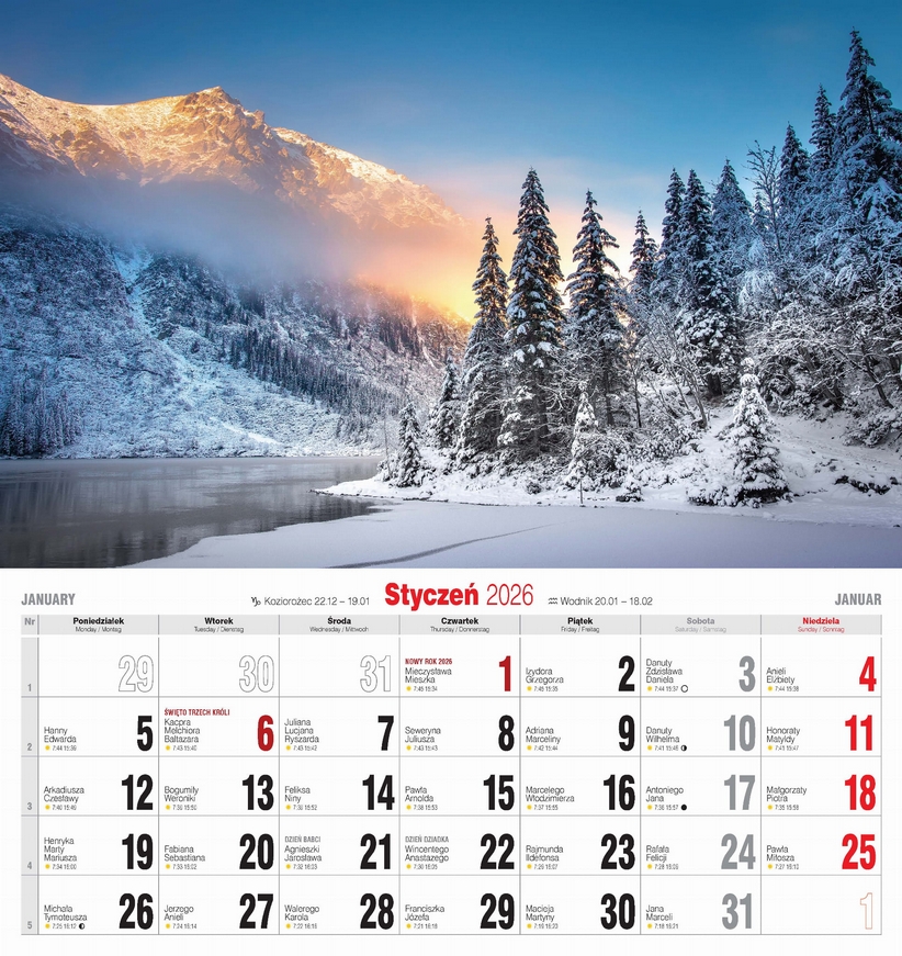 - Duży, solidny kalendarz ścienny, drukowany na papierze kredowym.