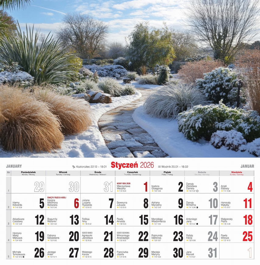 - Duży, solidny kalendarz ścienny, drukowany na papierze kredowym.