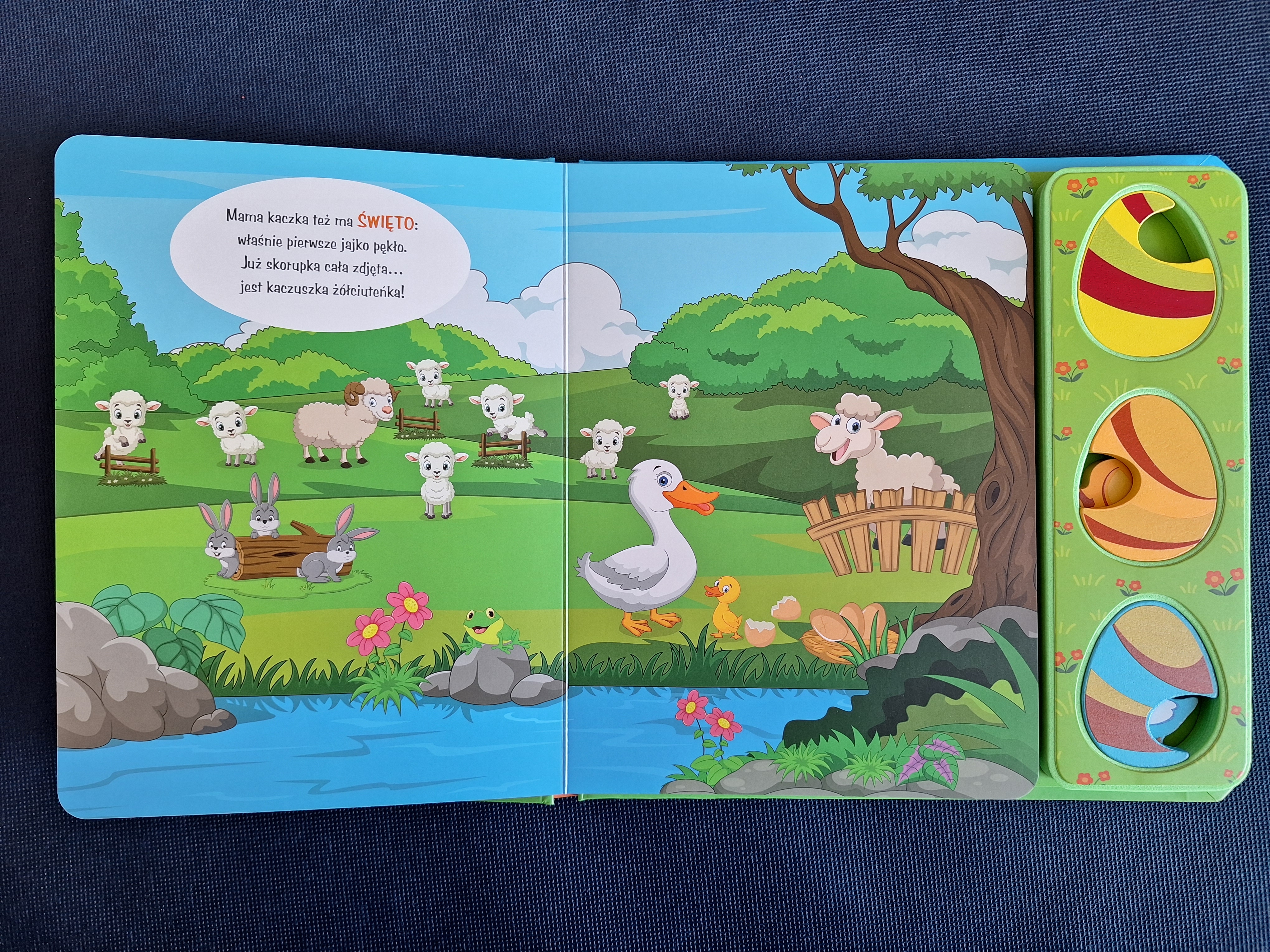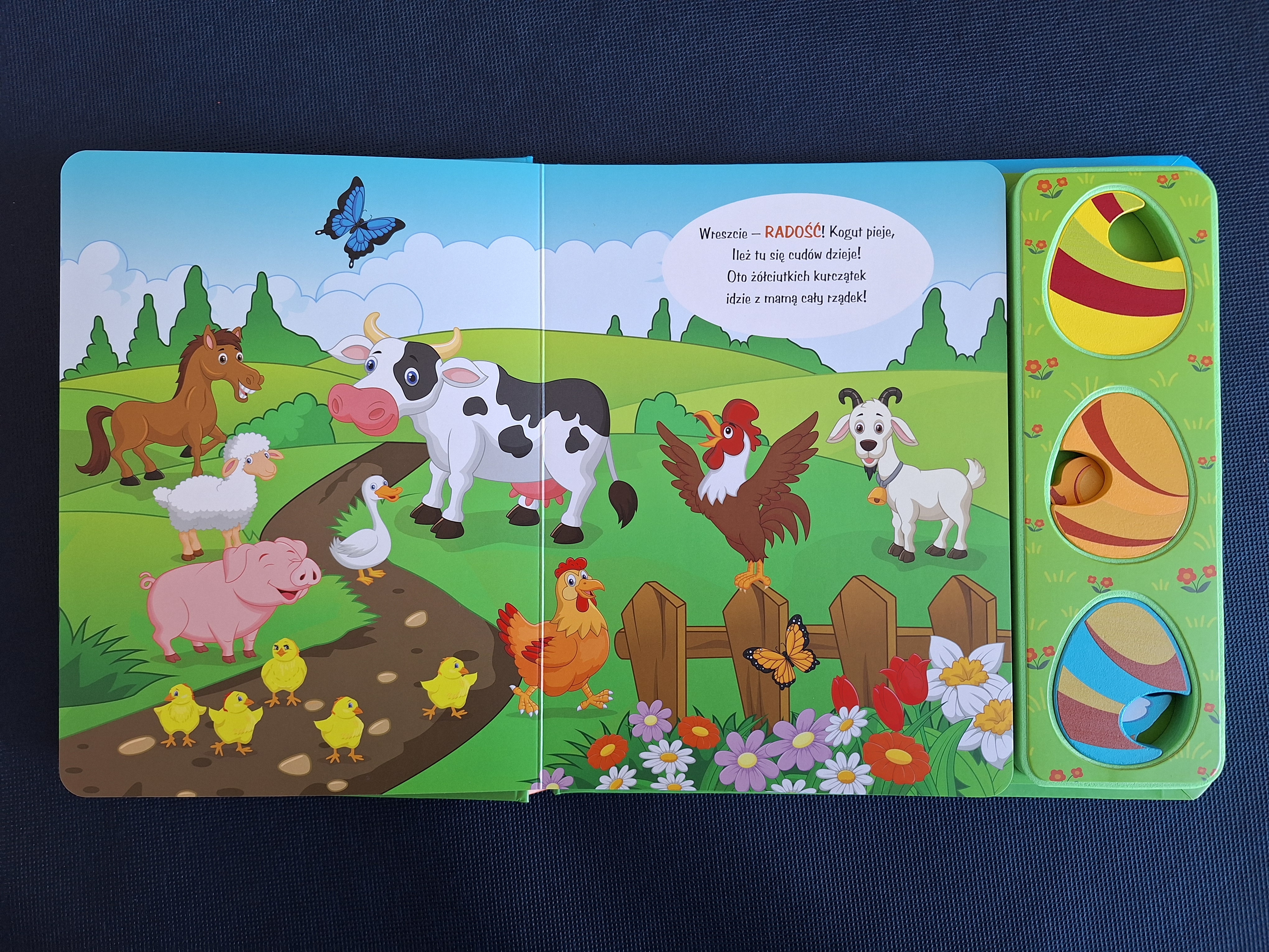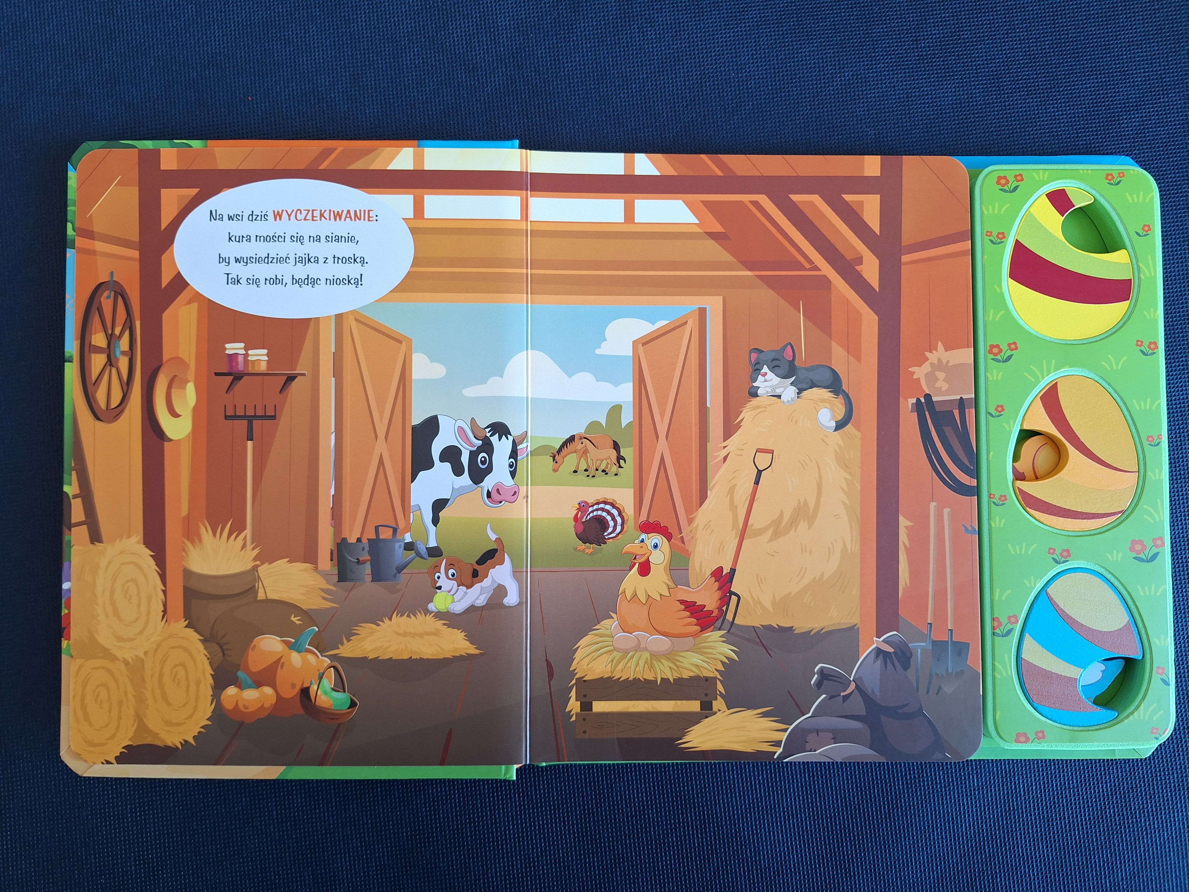 Krótkie wierszyki o mieszkańcach wiejskiej zagrody oraz nasycone kolorami ilustracje to dopiero początek przygody: każda z książek zawiera także zestaw 3 drewnianych pisklątek i jajeczek, pod którymi się one kryją!