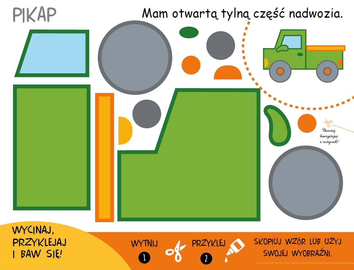 W zestawie znajduje się 16 barwnych wycinanek, dzięki którym dziecko może stworzyć własną kolekcję pojazdów – samochody osobowe, ciężarówki, traktory czy maszyny budowlane. Każdy model powstaje krok po kroku: wystarczy wybrać pojazd, wyciąć elementy i skleić je zgodnie z prostą instrukcją. Zabawa nożyczkami i klejem wspiera rozwój małej motoryki, uczy cierpliwości i koncentracji, a także rozwija poczucie sprawczości. Kolorowe ilustracje zachęcają do działania, a gotowe pojazdy mogą posłużyć do dalszej zabawy w odgrywanie scenek. Dzięki specjalnie zaprojektowanym nożyczkom dla najmłodszych każde dziecko z łatwością poradzi sobie z zadaniem i z dumą zaprezentuje własnoręcznie wykonane modele. To idealna propozycja na twórczą zabawę w domu i świetne przygotowanie do kolejnych wyzwań plastycznych.