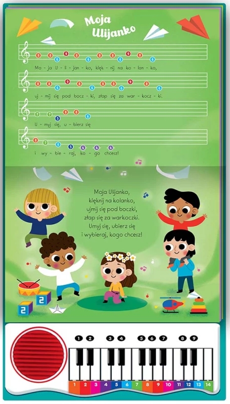 Siedem popularnych, znanych od pokoleń i ciągle lubianych polskich piosenek oraz siedem uproszczonych zapisów nutowych i pianinko, na którym dziecko może zagrać wszystkie zamieszczone w książce utwory.