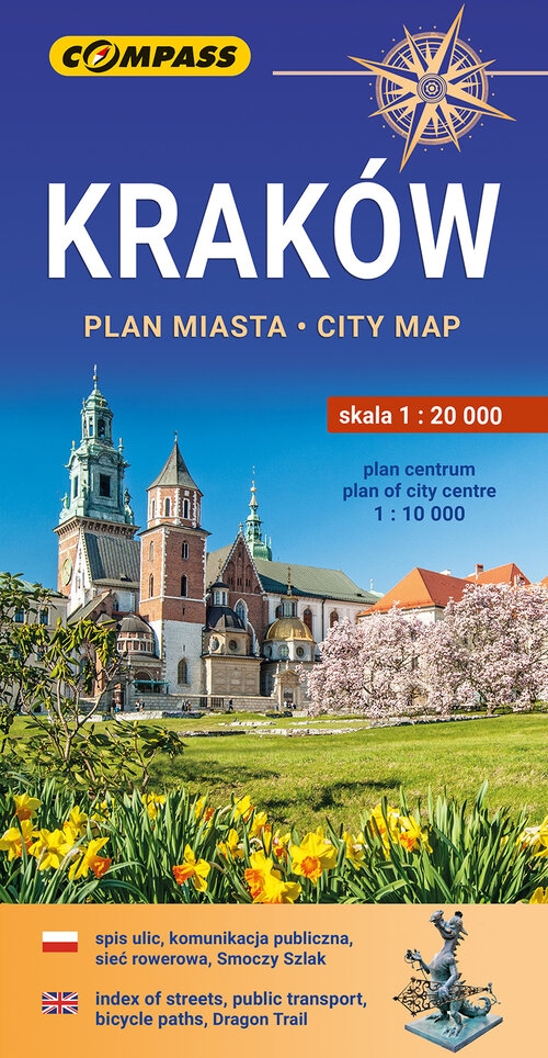 Szukasz aktualnej i dokładnej mapy Krakowa? Ten plan miasta Krakowa obejmuje całe miasto w granicach administracyjnych, a także część Wieliczki, Skawiny i Zabierzowa. To dwustronna publikacja, w której centrum Krakowa przedstawiono dodatkowo w powiększonej skali 1:10 000, co pozwala z łatwością odnaleźć nawet najmniejsze ulice i zaułki.