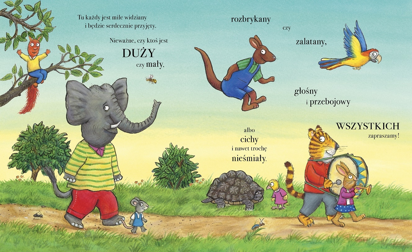 Wyobraź sobie świat, w którym każdy ciebie lubi. Fajnie by było, prawda? To zapraszamy: wejdź do tej książki. Tu każdy – nieważne mały czy duży, silny czy słaby, wesoły czy smutny, nieśmiały czy odważny, cichy czy głośny – będzie mile widziany i serdecznie przyjęty! Bo tu mieszka przyjaźń!