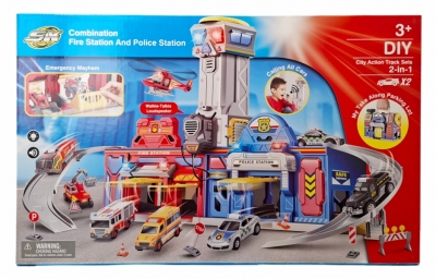 Zestaw remiza strażacka i komisariat policji 2w1. W zestawie budynki, pojazdy i akcesoria do zabawy. Zestaw wyposażony w walkie talkie. Produkt świeci kolorowym światełkiem i wydaje dźwięki. Produkt działa na baterie AAA. Baterie nie są załączone do zabawki. Zabawka przeznaczona dla dzieci od lat 3. Produkt zapakowany w kartonowe pudełko. Wymiary opakowania są wymiarami pudełka.
