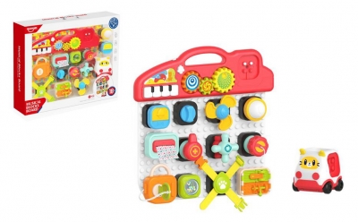 Interaktywna tablica edukacyjna z wieloma funkcyjnymi klockami oraz małym samochodzikiem. Klocki można mocować do tablicy jak i do samochodu. Mają różne funkcje np. można je ciągnąć lub kręcić nimi. Pianinko umieszczone na górze tablicy gra. Całość zawiera 15 elementów. Produkt działa na baterie AAA. Baterie nie są załączone do zabawki. Zabawka przeznaczona dla dzieci od 18 miesiąca życia. Produkt zapakowany w kartonowe pudełko. Podane wymiary są wymiarami opakowania.