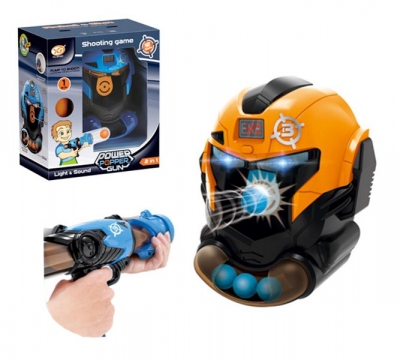 Pistolet z piłkami i interaktywną tarczą do strzelania w kształcie głowy robota z efektami świetlnymi i dźwiękowymi. Zabawka działa na baterie AA. Baterie nie są załączone do zabawki. Produkt występuje w kilku wersjach kolorystycznych, wybierany losowo. Cena dotyczy jednej sztuki. Zabawka przeznaczona dla dzieci od lat 6. Produkt zapakowany w kartonowe pudełko. Wymiary opakowania są wymiarami pudełka.