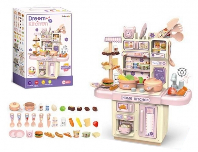 Kuchnia do zabawy z parą wodną i akcesoriami, w tym garnkami, naczyniami, sztućcami, warzywami i artykułami spożywczymi. Zestaw pozwala na odgrywanie scenek gotowania. Kuchnia wykorzystuje cykliczny system wody między umywalką, a kranem. Produkt działa na baterie AA. Baterie nie są załączone do zabawki. Zabawka przeznaczona dla dzieci od lat 3. Produkt zapakowany w kartonowe pudełko. Wymiary opakowania są wymiarami pudełka.