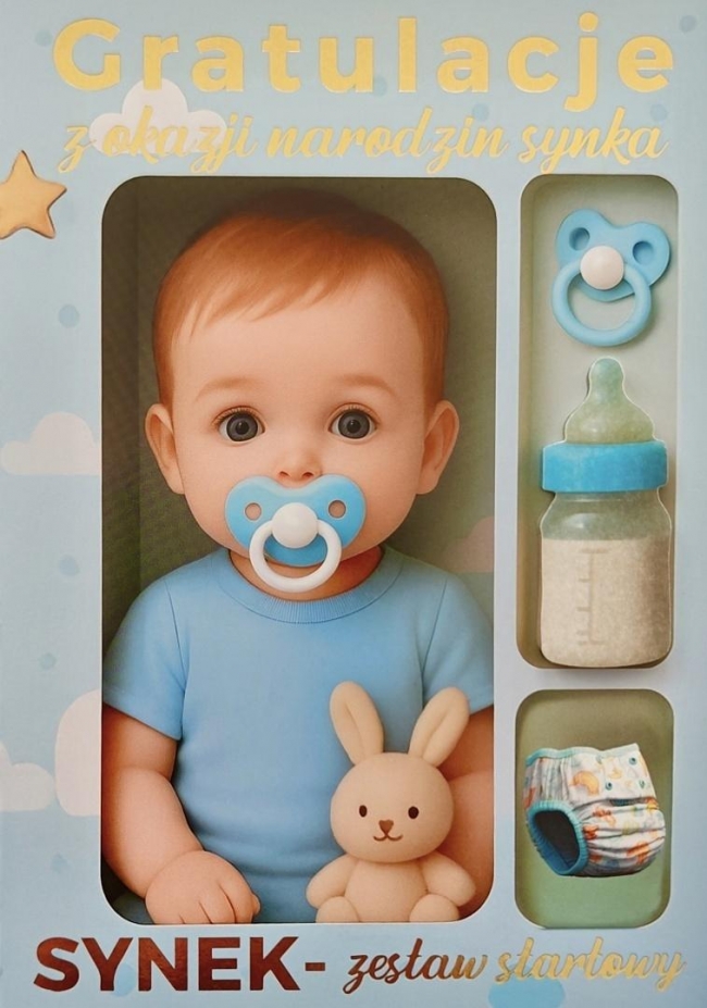 Karnet 3K to bogato zdobiony karnet z elementem naklejanym oraz złoceniem. Karnet to doskonały dodatek do prezentu. Karnet zawiera również zabawne życzenia.