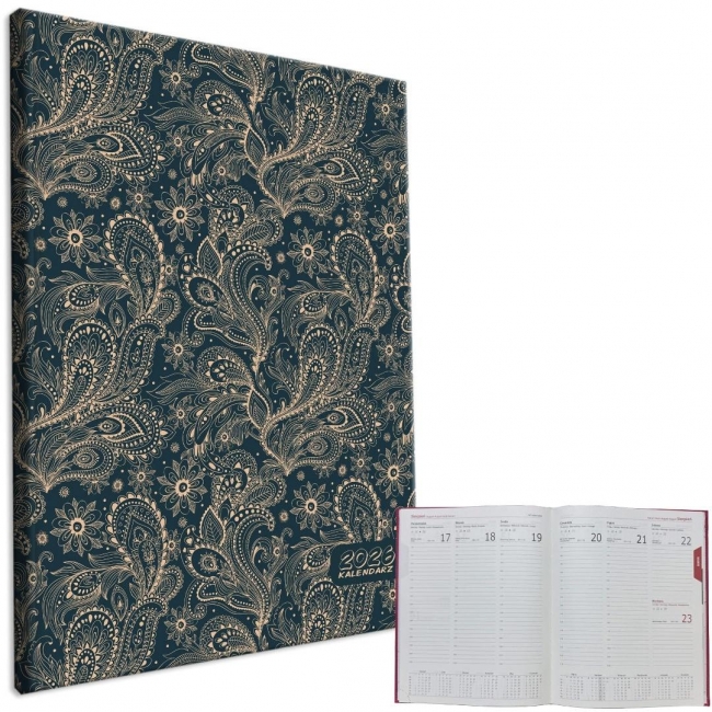 kalendarz formatu A4, układ tygodniowy, okładka aksamitna soft touch, papier chamois