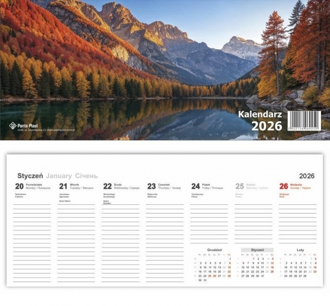 Opis: Kalendarz 2026 biurkowy poziomy mix