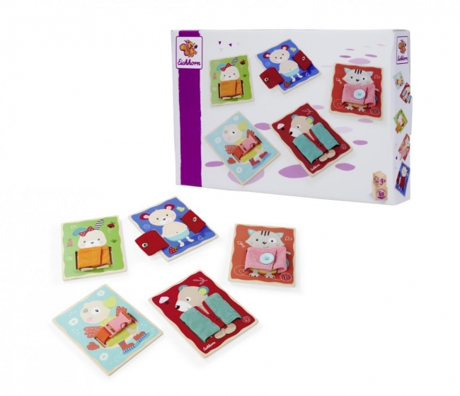 5 różnych połączeń: rzep, zamek, klips, guzik, zatrzask; 10 elementów, 18 x 14 cm, FSC(R) 100%, sklejka, tkanina, plastik, 3l+