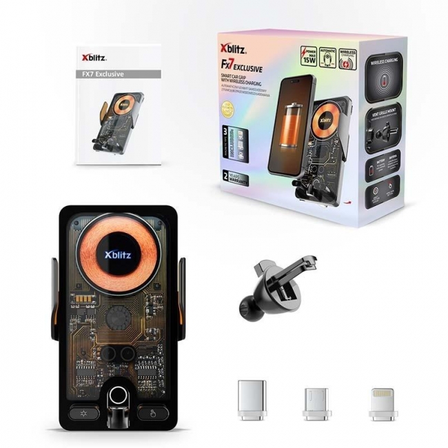 Xblitz FX7 Exclusive to aktywny uchwyt z funkcją ładowania indukcyjnego do 15 W oraz opcją zasilania przewodowego za pomocą magnetycznych końcówek. Jego ramiona otwierają się automatycznie, a wbudowana bateria pozwala korzystać z mechanizmu nawet po wyłączeniu auta. Futurystyczny wygląd z odsłoniętym mechanizmem sprawia, że FX7 wyróżnia się na tle innych modeli.