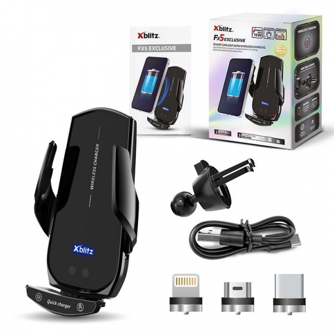 Xblitz FX5 Exclusive to automatyczny uchwyt samochodowy z funkcją szybkiego ładowania indukcyjnego do 15 W. Wbudowany sensor wykrywa telefon i uruchamia mechanizm zaciskowy, a przycisk do otwierania ramion działa także bez podłączenia do zasilania. Jego płaska, symetryczna forma i dopracowane detale idealnie wpisują się w nowoczesne wnętrza aut.