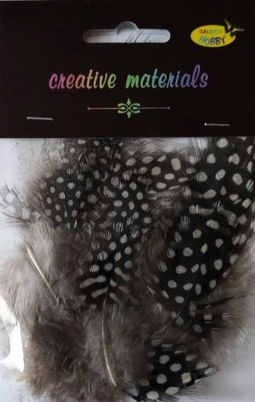 Piórka perliczek z charakterystycznym nakrapianiem w opakowaniu z eurozawieszką. Opakowanie zawiera 15 piórek w wielkościach 10-15 cm.