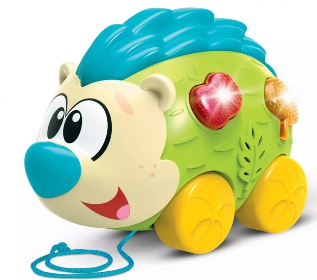 Słodziak na kółkach bawi dźwiękiem i światełkami! Jeżyk ze sznureczkiem do prowadzenia rączką, posiada na boku dwa aktywne przyciski, w kształcie grzybka i jabłuszka, które po naciśnięciu świecą, a także aktywują melodie oraz edukacyjne piosenki. Na drugim boku jeżyka znajduje się motylek, który podczas przesuwania zabawnie terkocze. Zwierzak wyposażony został w praktyczny przełącznik ON/OFF, umożliwiający wyłączenie jeżyka po zakończonej zabawie.