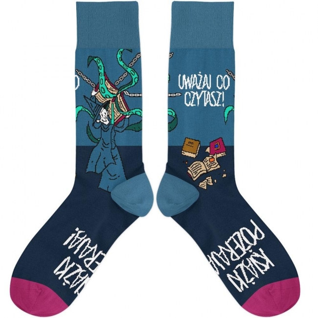 Niektóre książki dosłownie pożerają może niekoniecznie swych czytelników, ale na pewno ich wolny czas. Uważaj na to, co czytasz i w jakich okolicznościach. Skarpetki z Wiedźmą i żarłoczną księgą będą dla Ciebie przestrogą. Świetnie sprawdzą się też w roli prezentu dla każdego mola książkowego.