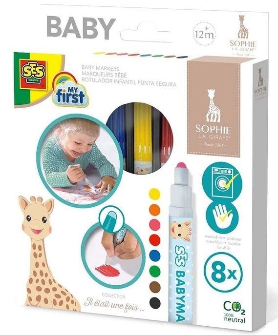 Malowanie dla najmłodszych! Z tym zestawem od SES Creative nawet najmłodsi od 12 miesiąca życia staną się małymi artystami. Markery dla dzieci z żyrafą Sophie są niezwykle bezpieczne i zaprojektowane specjalnie dla najmłodszych artystów. Wyjątkowo mocny okrągły wkład ułatwia rysowanie unikalnych linii na papierze. Dzięki 8 różnym kolorom dzieci mają szeroki wybór i wcześnie uczą się realizować swoją kreatywność - tak, jak chcą. Wspomaga to koordynację ręka-oko i zdolności motoryczne, a także poczucie koloru i kształtu.
