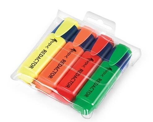 Komplet 4 zakreślaczy. Fluorescencyjny tusz na bazie wody. Intensywne kolory. Precyzyjna ścięta końcówką zakreślającą. Obudowa w kolorze tuszu. Do użytku na wszystkich rodzajach papieru.