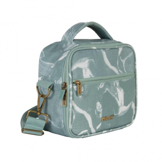 Izotermiczna torba na żywność z 3 pojemnikami na lunch: jedno prostokątne i dwa okrągłe. Torba posiada izolowane na zimno i na gorąco wnętrze dla lepszej konserwacji żywności. Pełne otwarcie dla lepszej dostępności i czyszczenia. Praktyczna kieszeń wewnętrzna na suwak oraz mała kieszonka zewnętrzna zapinana na suwak. Regulowany i odpinany pasek na ramię. Uchwyt do noszenia lub wieszania. Kolor zielony. Seria Lava inspirowana jest erupcjami wulkanów i ruchem stopionej skały. Kolory przywołują różne odcienie tego zjawiska geologicznego i w połączeniu ze złotem tworzą wyrafinowany efekt wizualny. Skład tkaniny: tkanina zewnętrzna poliestrowa i izotermiczna podszewka wewnętrzna (P.E.V.A.). Rozmiar: 23 x 20 x 11 cm. Pojemność torby: 3,5 litry. Torba zawiera: 1 duży prostokątny beżowy pojemnik 0,75l oraz 2 mały okrągłe beżowe pojemnik hermetyczne 0,25l z zakręcaną pokrywką. Duży pojemnik posiada wewnętrzną przegrodę, która umożliwia rozdzielenie dwóch rodzajów żywności w tym samym pojemniku oraz granatowy zewnętrzny elastyczny pasek silikonowy. Pojemniki nadają się do odgrzewania w kuchence mikrofalowej (maks. 70oC) z otwartą pokrywą dla uwolnienia pary. Nadają się także do przechowywania w zamrażarce (do -20oC) i do mycia w zmywarce do naczyń (maks. 70oC). Pokrywy i pojemniki można łatwo łączyć ze sobą. Matowe zewnętrzne wykończenie ułatwia uchwyt. Wnętrze z zaokrąglonymi narożnikami i błyszczącym wykończeniem dla lepszego czyszczenia. Materiał pojemników: tworzywo sztuczne wolne od BPA.