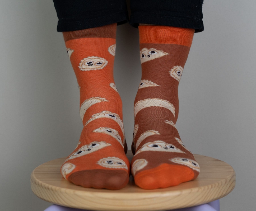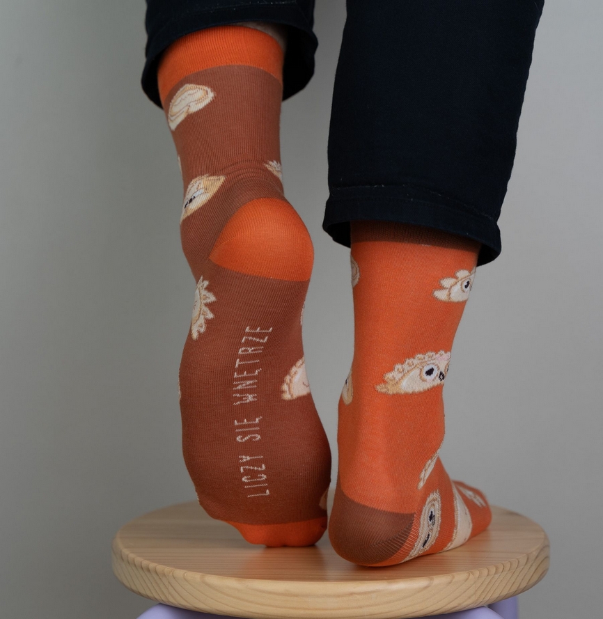 Wyjątkowy design sprawia, że te skarpetki będą idealnym prezentem dla każdego fana kuchni polskiej lub oryginalnych dodatków. Wyraź swoją miłość do pierogów od stóp do głów – dosłownie!
