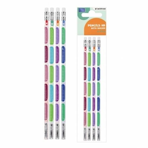 Ołówek nie łamie się podczas strugania, a gumka nie brudzi, ołówki to podstawowy produkt podczas nauki w szkole (rysowanie, matematyka, pisanie), łatwe w struganiu, nie łamią się, nie brudzą, uniwersalna twardość HB, każdy ołówek wyposażony w gumkę do mazania. Zestaw 4 ołówków z gumką z kolekcji STARPAK z grafiką w tabliczkę mnożenia. Każdy ołówek zdobiony kolorową grafiką. Wykonany z trwałego drewna, zapewnia komfort rysowania i pisania. Służy nie tylko do rysowania i szkicowania, ale jest również niezbędny podczas lekcji matematyki, do nauki pisania, do robienia notatek na marginesach książek lub zeszytów. Dlatego tak ważna jest jego jakość. Dzięki wysokiej jakości grafit nie sypie się, nie brudzi i nie kruszy. Twardość HB sprawia, że ołówki STARPAK są uniwersalne i mogą być wykorzystywane zarówno do pisania, jak tez rysowania. Zapoznaj się również z innymi produktami STARPAK! Zawartość opakowania: 4 szt. ołówków z gumką. Wykonane z odpornego, nie łamiącego się podczas strugania grafitu. Wymiary/waga: wymiary produktu (dł.)[cm]: 19 cm, wymiary opakowania (wys. x szer. x gł.)[cm]: 25x5x1, waga produktu bez opakowania 1szt.[kg]: 0,01 kg, waga produktu w opakowaniu [kg]: 0,02 kg. Produkt przeznaczony dla dzieci w wieku: 3+. Ołówki pakowane w folijkę z zawieszką.