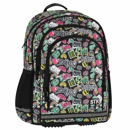 Plecak składa się z 1 dużej komory i 2 obszernych przednich kieszeni, 2 boczne wzmocnione kieszenie siatkowe na butelkę z napojem, wytrzymałe zamki błyskawiczne, plastikowe stopki na spodzie plecaka (ochrona przed wilgocią i brudem), ergonomiczne plecy i szelki, plecy z systemem wentylacji dla większego komfortu, grube, miękkie szelki chronią ramiona, regulowane szelki pozwalają dopasować plecak do wzrostu i budowy ciała, uchwyt wzmocniony gumową opaską pozwalające zawiesić plecak na wieszaku lub wygodnie nosić go w ręce, odblaskowe paski umieszczone na przedniej kieszeni, na obu bocznych kieszeniach i na szelkach zwiększające widoczność plecaka w nocy (bezpieczeństwo dziecka). Plecak szkolny składający się z dwóch komór zapinanych na zamek, co pozwoli na lepsze zorganizowanie wewnętrznej przestrzeni. Na zewnątrz znajduje się bardzo obszerna przednia, zapinana kieszeń, po bokach dwie kieszenie ze ściągaczem idealne na umieszczenie w nich bidonu z napojem. Plecy i szelki wyściełane gąbką zapewniają komfort użytkowania i równomierne rozłożenie obciążenia na plecach dziecka. Wykonany z trwałego materiału wykończonego elementami odblaskowymi dla większego bezpieczeństwa. Zapoznaj się również z innymi produktami STARPAK dedykowanymi młodzieży. Plecak w czarnym kolorze z młodzieżową, kolorową grafiką. Plecak jest wyrobem tekstylnym. Przeznaczony dla dzieci w wieku: 3+. Wymiary produktu (wys. x szer. x gł.) [cm]: 40x29x20, pojemność plecaka 23 l, waga produktu [kg]: 0,72 kg. Plecak pakowany w folię.