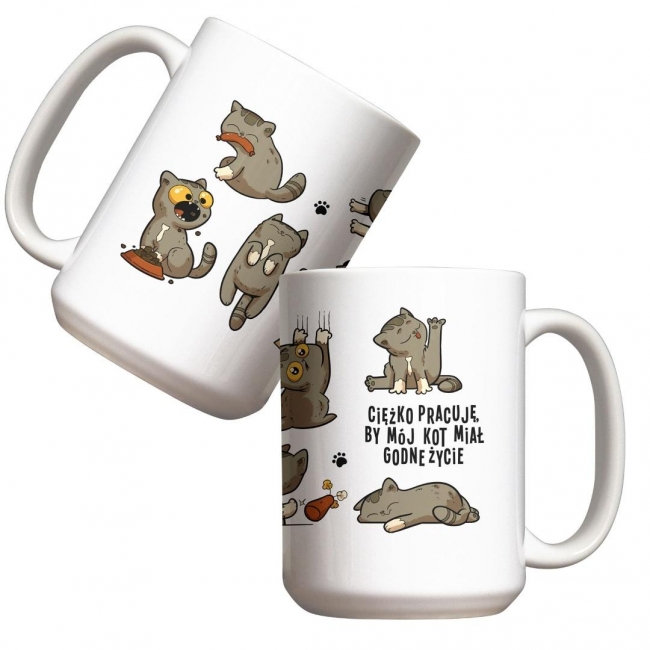 Ciężko pracujesz, by Twój kot żył na godnym poziomie? Dobrze rozumiemy ten stan i właśnie dlatego mamy w swojej ofercie kubek w sam raz dla Ciebie. Możesz zabrać go do pracy lub używać w domowym zaciszu. Sprawdzi się również jako doskonały prezent dla każdego kociarza i dla każdej kociary! Pojemność: 440ml Wysokość: 120 mm Średnica: 85 mm Materiał: ceramika